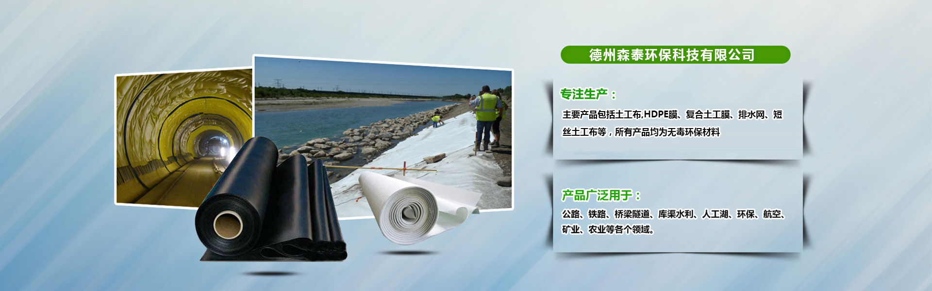 德州森泰環(huán)?萍加邢薰,森泰環(huán)保專注于水利、環(huán)境及生態(tài)修復(fù)技術(shù)研發(fā)及產(chǎn)品制造,并有專業(yè)的施工工程技術(shù)服務(wù)團(tuán)隊(duì)。已完成水利工程100多項(xiàng),環(huán)境工程200多項(xiàng),典型工程包括南水北調(diào)工程、三峽工程、滹沱河防滲工程,保定環(huán)城水系工程、濟(jì)南垃圾填埋場(chǎng)工程,桂林垃圾填埋場(chǎng)工程、大同電廠防滲工程、嘉興火車站防滲工程、黑龍江農(nóng)墾防滲工程等。森泰環(huán)保主要產(chǎn)品包括土工布,HDPE膜、復(fù)合土工膜、排水網(wǎng)、短絲土工布等,所有產(chǎn)品均為無(wú)毒環(huán)保材料,可廣泛應(yīng)用于:1.環(huán)境修復(fù)工程(糧食基地土壤改良、工業(yè)場(chǎng)地、礦業(yè)、水體等工程、蔬菜大棚,養(yǎng)殖,種植等)2.水利工程(江河水庫(kù)、堤壩的防滲加固、水渠的防滲、護(hù)坡等)及市政防滲(地鐵、建筑物的地下工程、種植屋面、屋頂花園的防滲、污水管道內(nèi)襯等)......